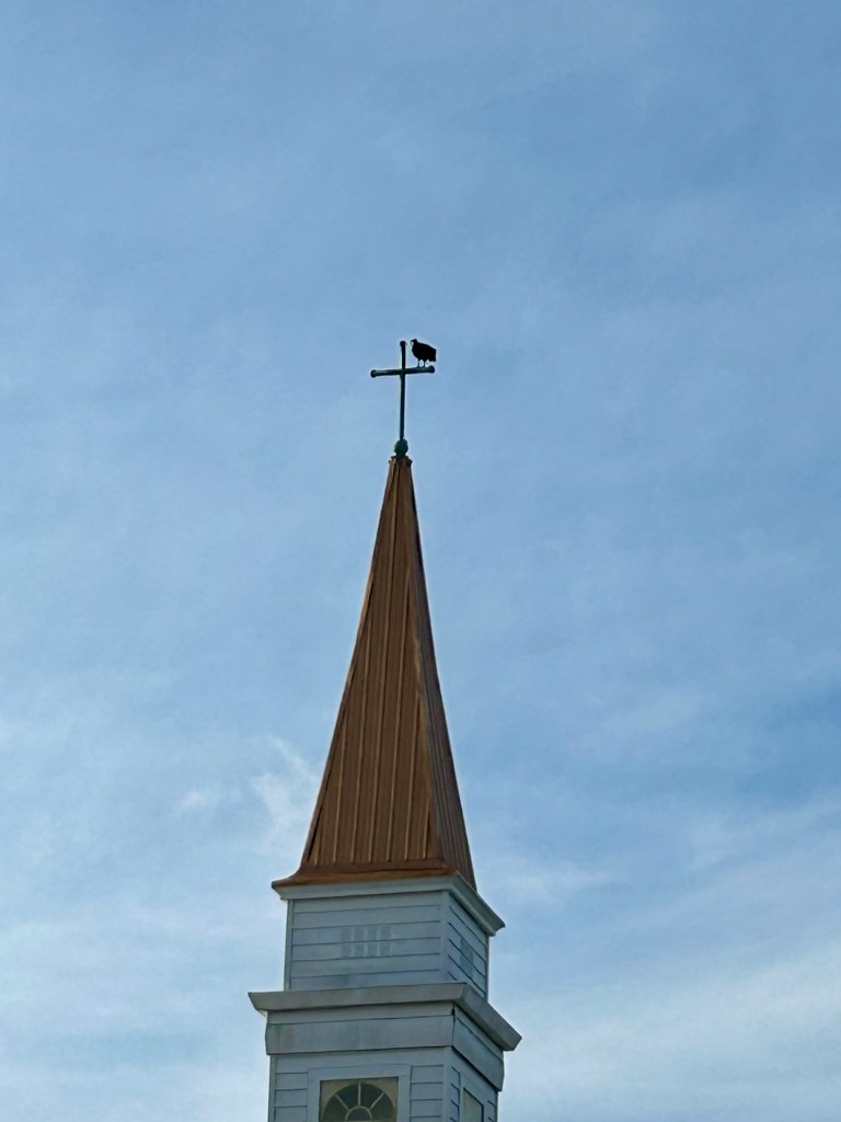 In my hometown, the First Baptist Church sits at the center of the city. I have noticed on numerous recent occasions that a bird (or birds) likes to sit on the cross of this church’s steeple. This bird takes a break from its flight by sitting perched atop the cross.